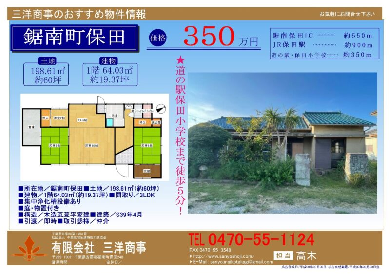 - JR内房線 保田駅 徒歩900m 徒歩12分